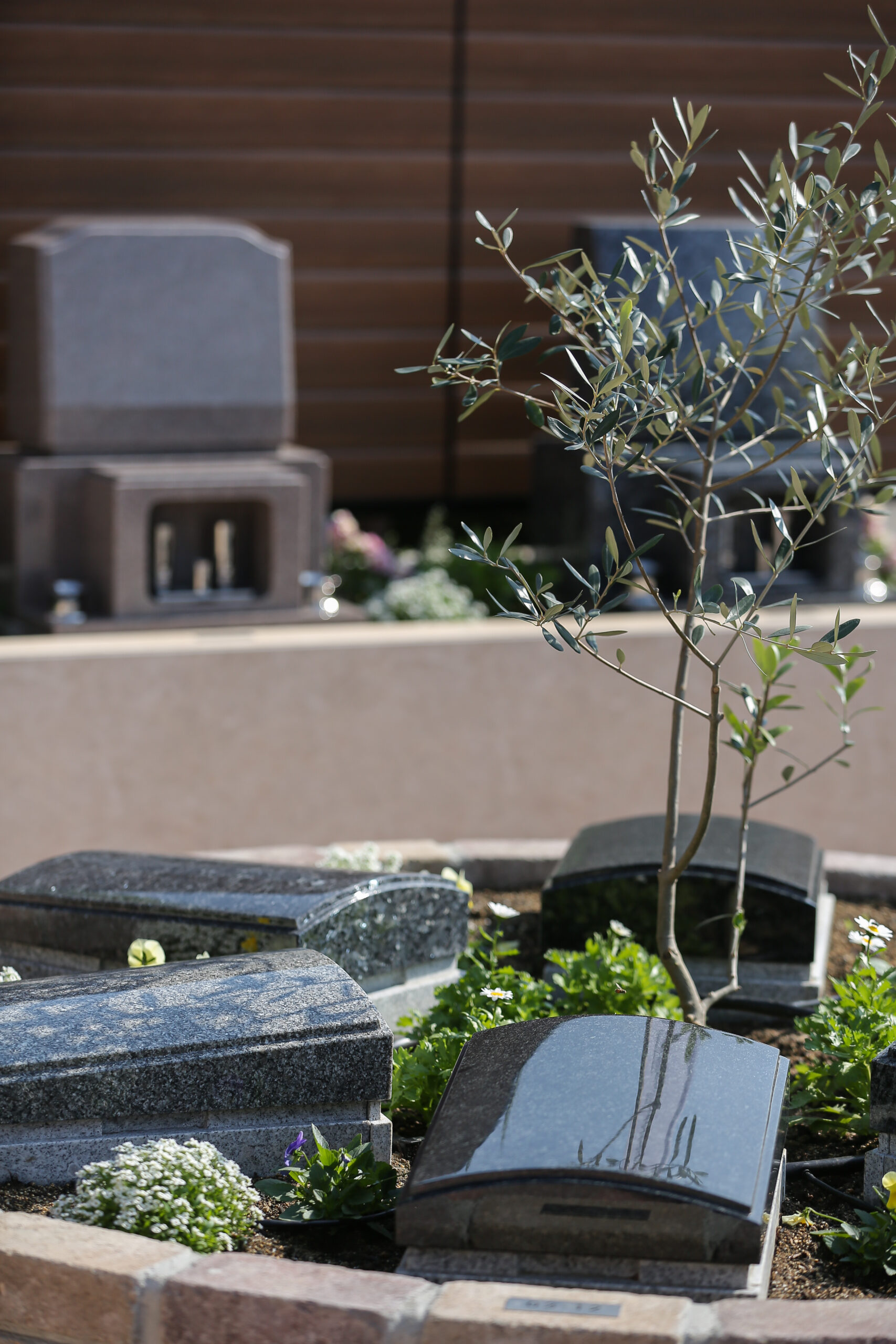 古木オリーブを奥に見据え、緑に囲まれた雰囲気のお墓になります。多彩な彫刻オプションで、各々の家族らしいお墓をつくってください。