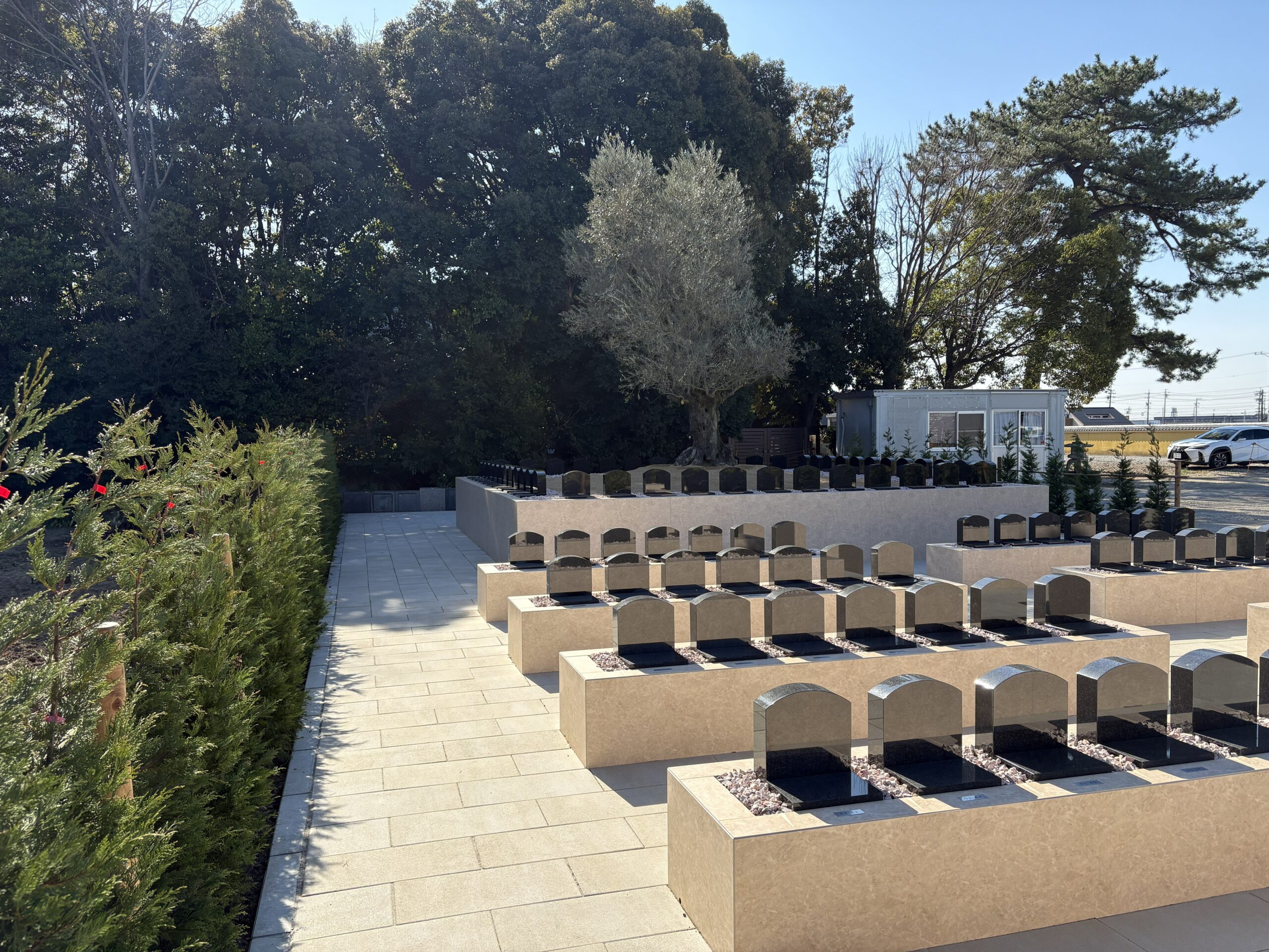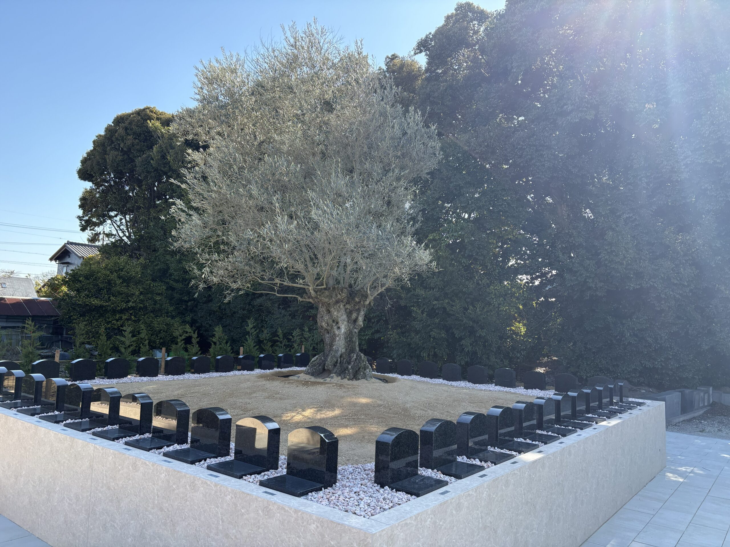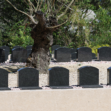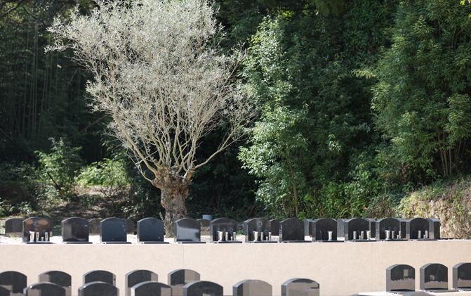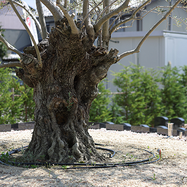 古木オリーブを奥に見据え、緑に囲まれた雰囲気のお墓になります。多彩な彫刻オプションで、各々の家族らしいお墓をつくってください。