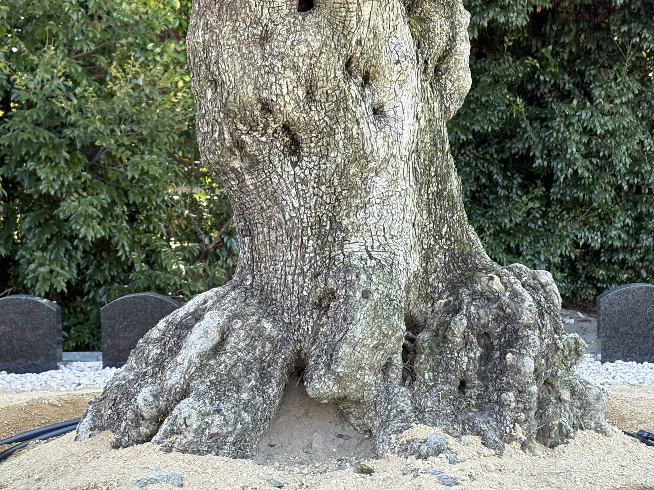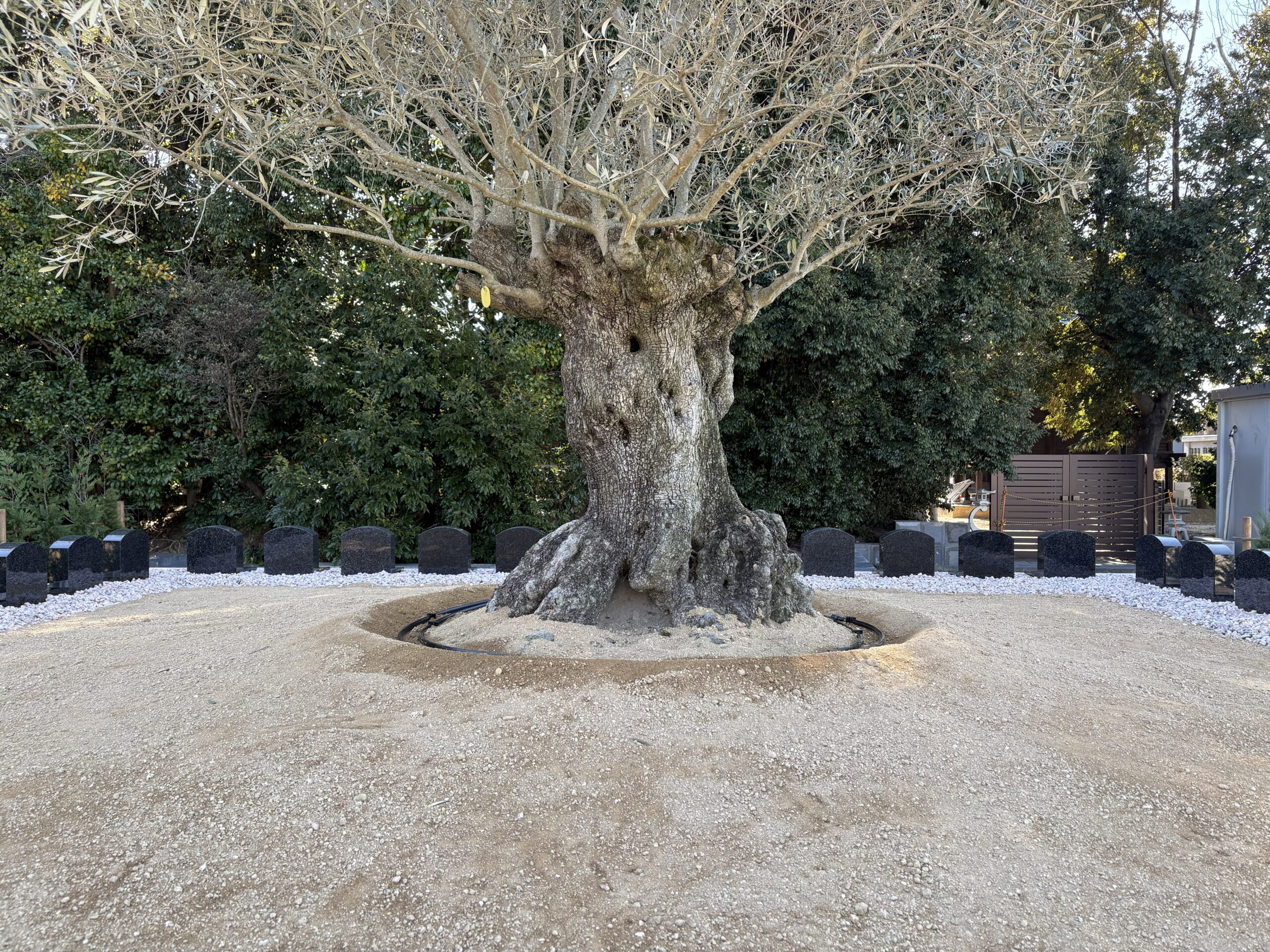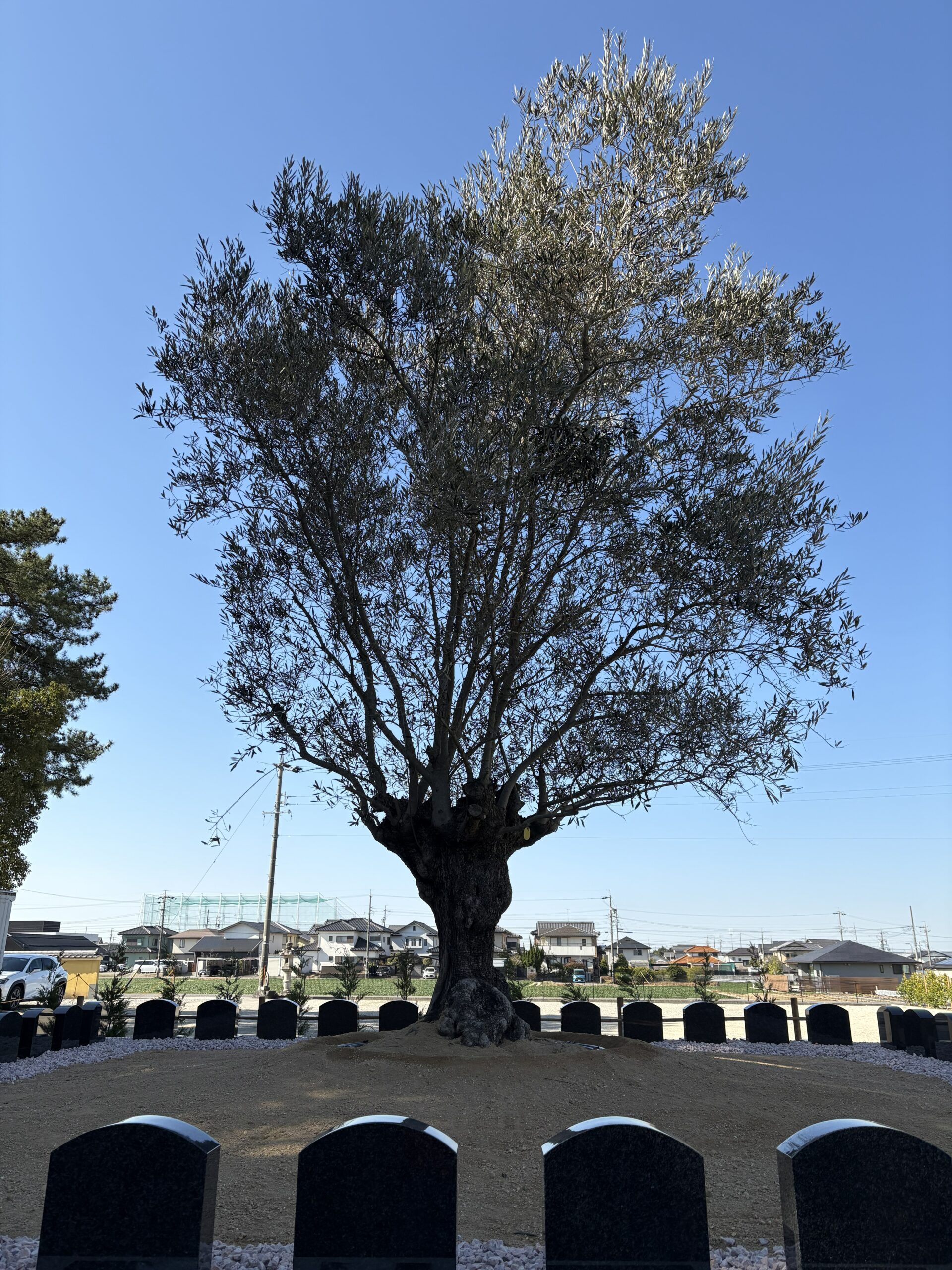 古木オリーブを奥に見据え、緑に囲まれた雰囲気のお墓になります。多彩な彫刻オプションで、各々の家族らしいお墓をつくってください。